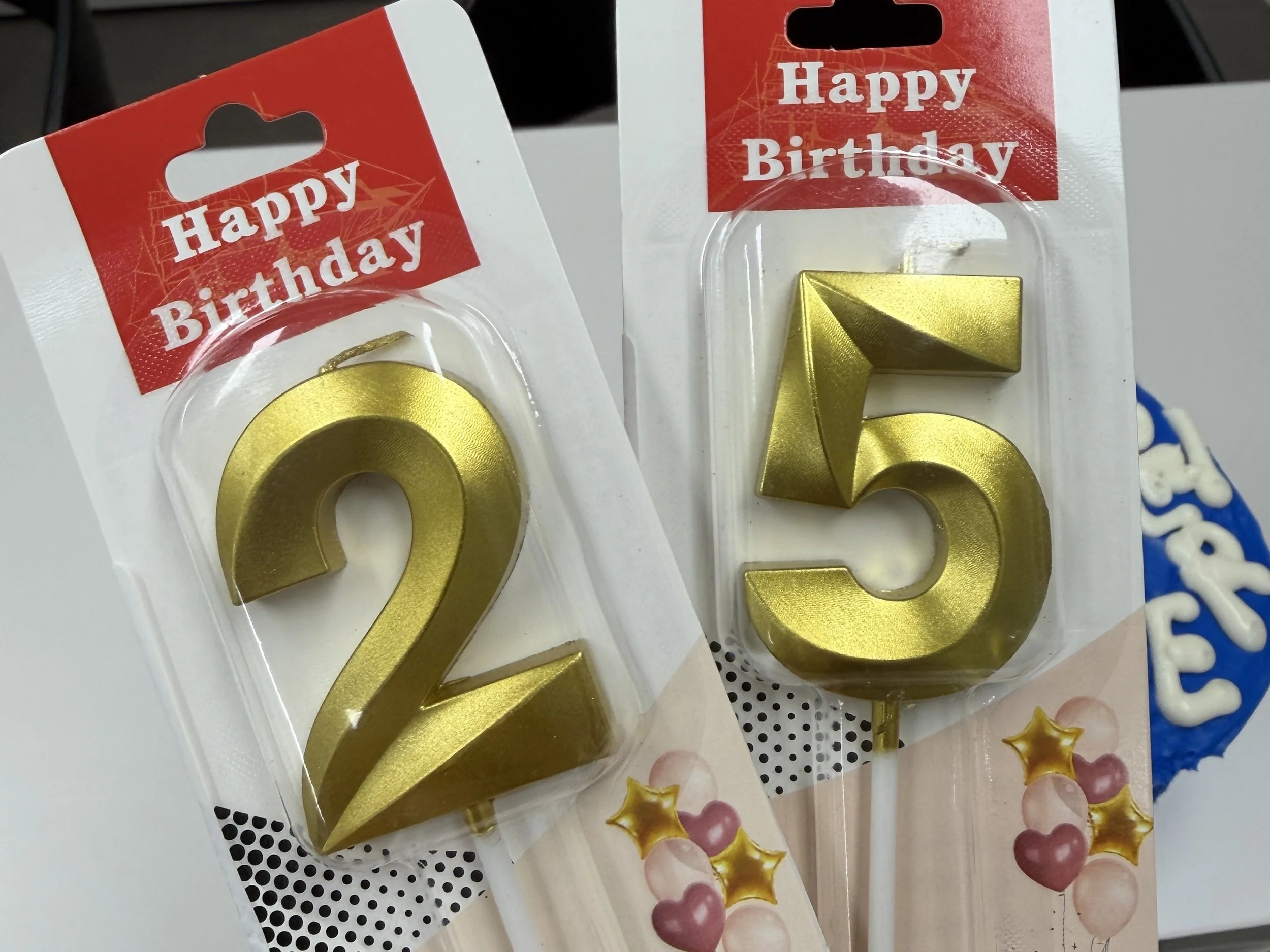 미리 주문해두었던 숫자 2와 5 모양의 빅초입니다 🕯️ 블루 케이크에 골드 초 조합이면, 그냥… “끝!” ✨
