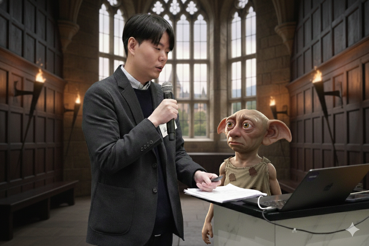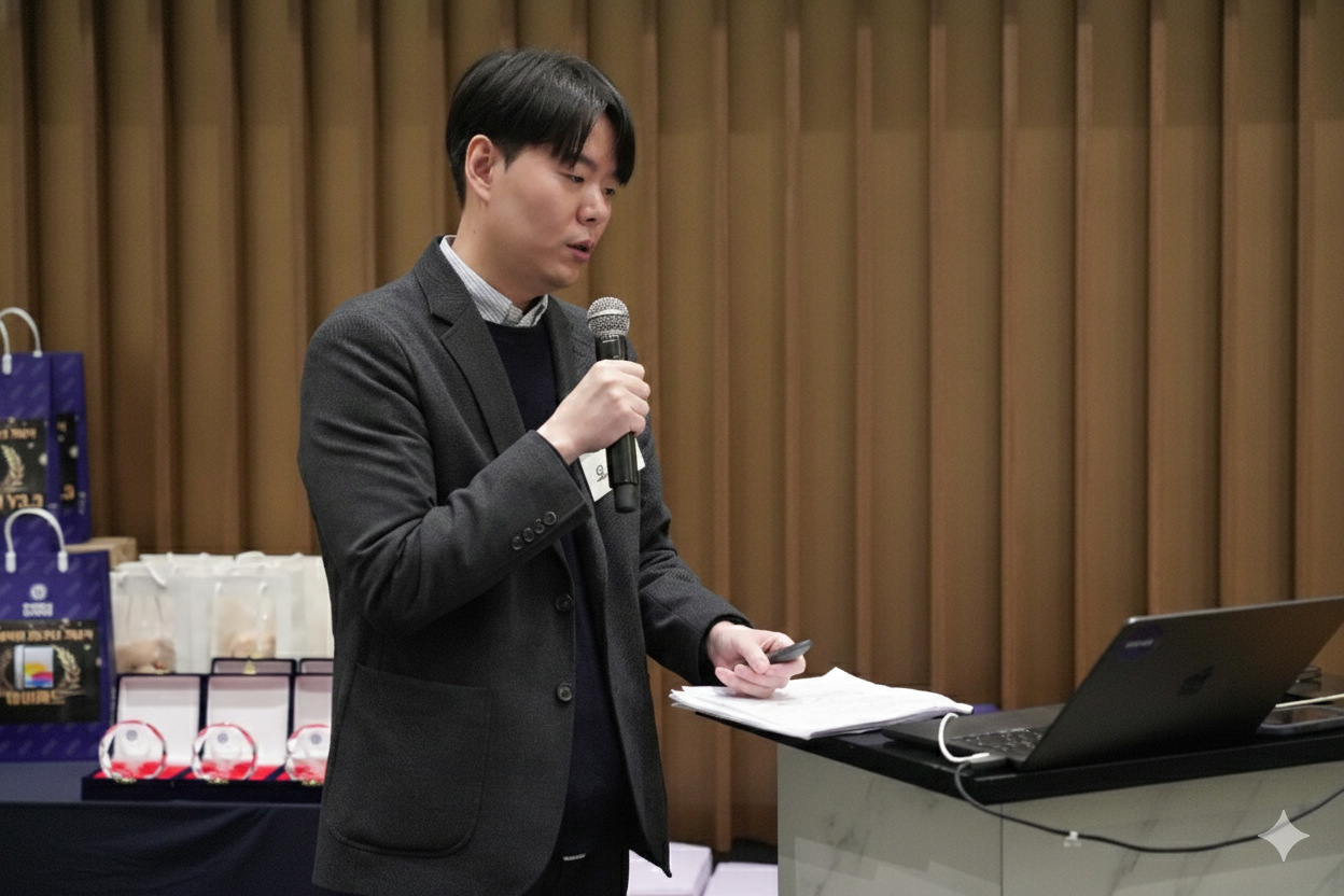 한편, 이교수님과 공동 MC를 맡으신 오교수님은 큐시트와 PPT를 번갈아 확인하시며 준비에 여념이 없으셨는데요 ㅎㅎ 그러다 우연히 찍힌 사진을 보니, 교수님 표정이 왜 이렇게 수심이 깊어 보이시는지 ㅋㅋ 한… 5년쯤 더 나이 들어 보이시는 느낌이랄까요. 거의 나라를 잃으신 분 같기도 하고 ㅠㅠ (아니면 워낭소리… 아니면 하이닉스 주식 없는 사람 표정… 🤔) 아무튼 교수님, 후딱 해치우고(?) 무사히 끝내시길 진심으로 기원해봅니다… 🙏😆