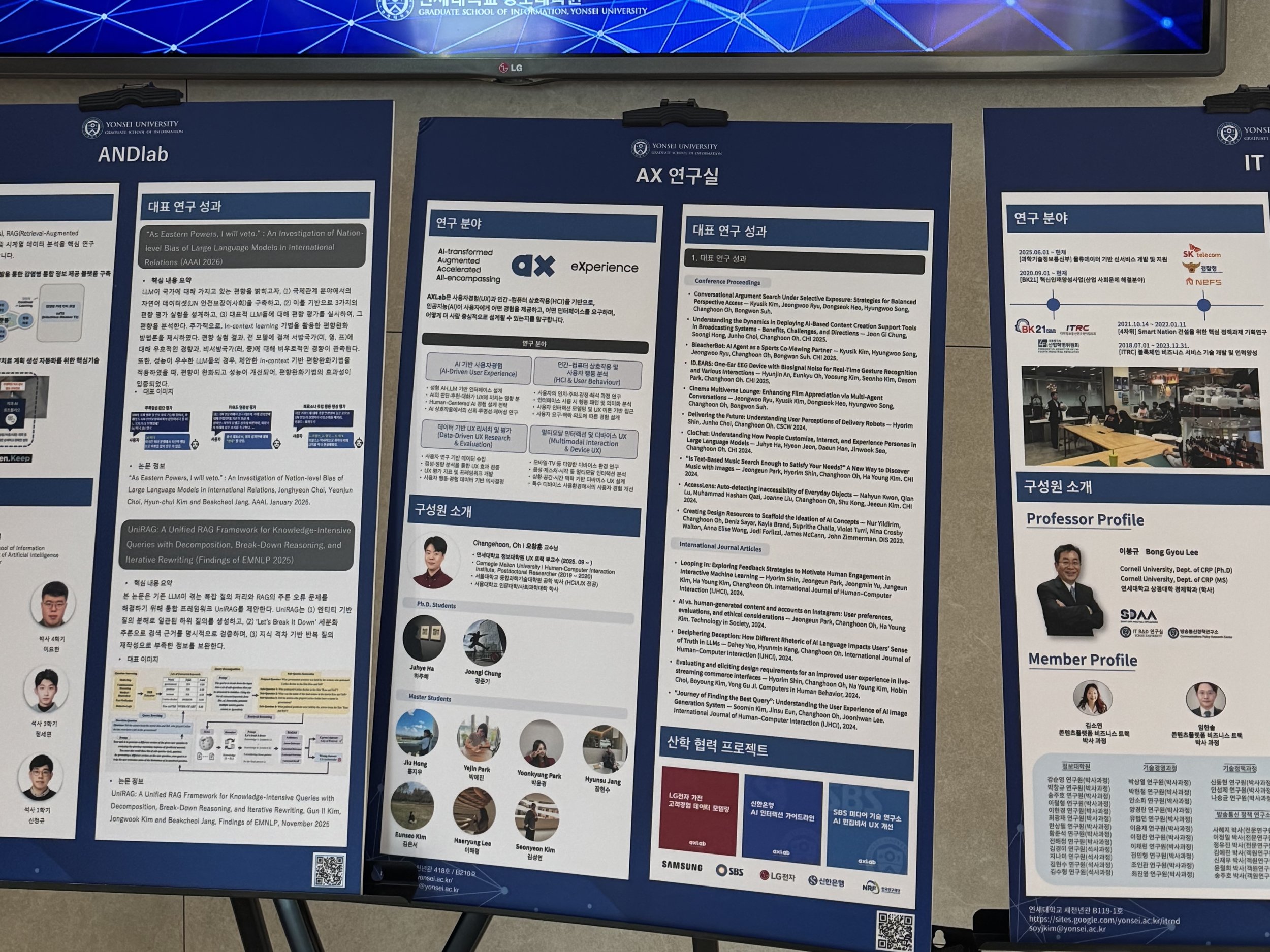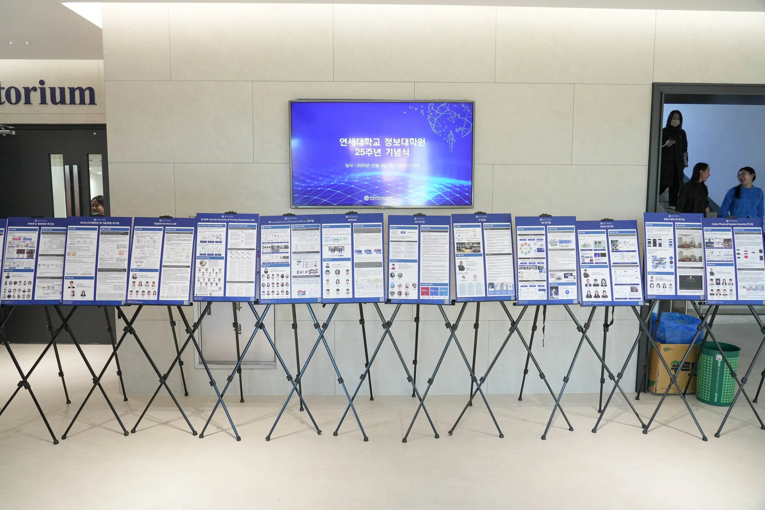 행사장 앞쪽에는 이렇게 포스터 세션(?) 비스무리한 공간이 마련되어 있었는데요 👀 자세히 살펴보니, 정보대학원 각 연구실을 소개하는 포스터들이 전시되어 있더라고요~ 🖼️✨