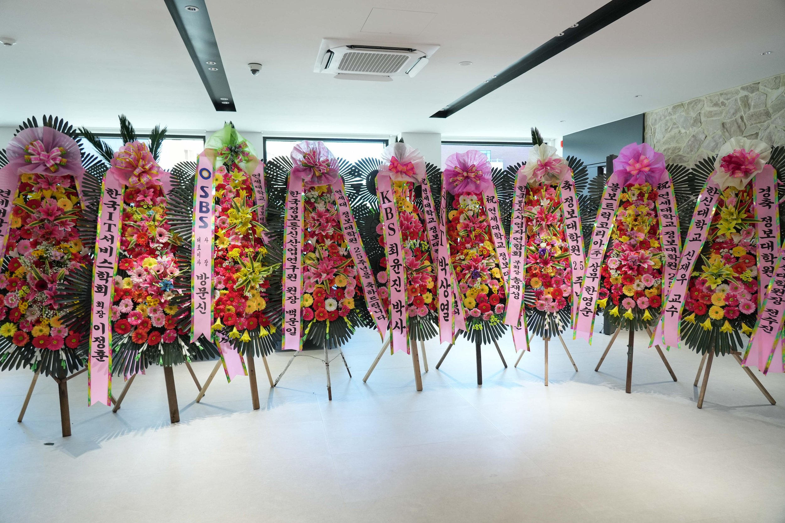 정말 엄청난 화환들의 행렬이 아닐 수 없겠습니다 🌸 정보대학원 출신 분들께서 여러 통신사와 미디어 회사로 진출해 계셔서인지, SBS, KBS, KT 등에서도 화환을 보내주셨고, 이외에도 여러 학술대회와 학교들에서 축하의 마음을 담아 화환을 보내주셨습니다.