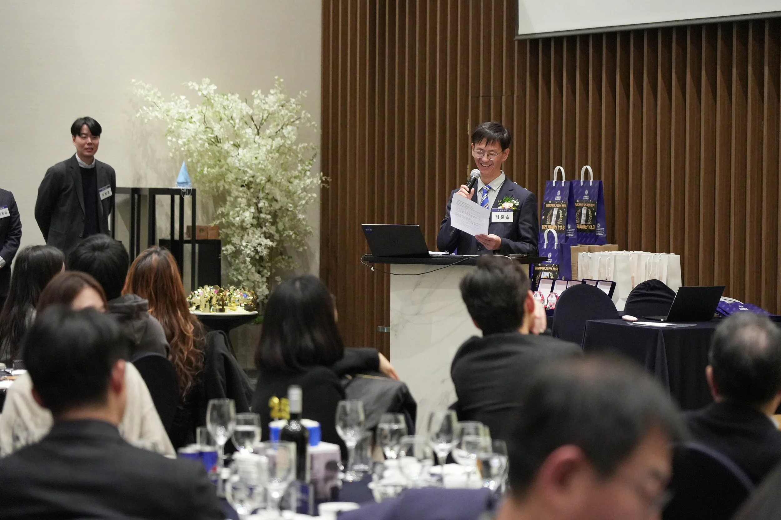 만찬이 끝나갈 즈음, 다시 이교수님과 오교수님이 MC석에 등장하셨고, 오늘 행사의 하이라이트라고 할 수 있는 특별상 시상, 퀴즈, 그리고 경품 행사를 차례로 이어가며 분위기를 다시 한 번 끌어올려 주셨답니다 🎁😆