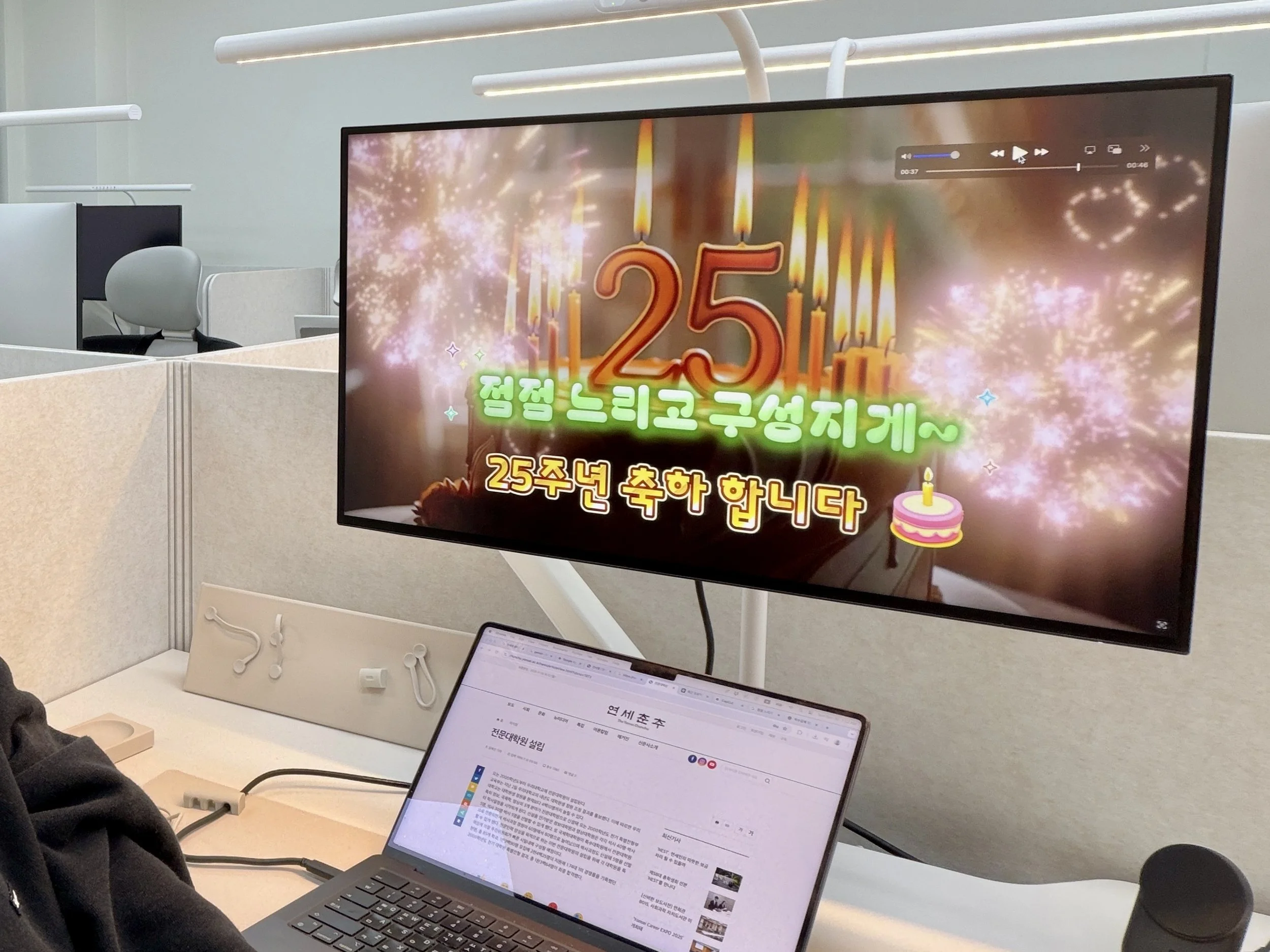 아무래도 25주년 행사이다 보니, 케이크와 함께 생일 축하 노래를 불러야겠다는 생각이 드셨던 걸까요 🎂🎶 이렇게 손수 배경화면과 BGM을 결합한 노래방 영상을 제작하셨다는 오교수님… (브금은 참고로 유튜브에서 가져옴 🤫)