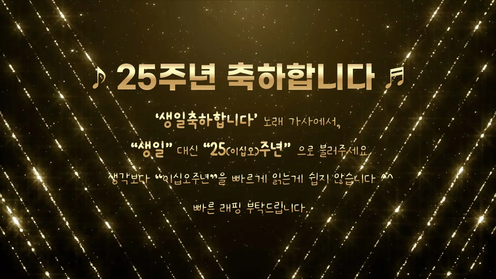 네… 😅 생성형 AI로 25주년 케이크를 배경으로 만들고, 다 같이 따라 부르기 쉬운 노래방 화면까지 준비해보셨다고 하는데요. 과연 본 행사에서 사람들이 기존 가사인 “생일” 대신, “이십오주년”이라는 5음절 단어를 구성지게(?) 함께 잘 따라 불러줄 수 있을지, 그리고 마지막을 느리고 구성지게 부를 수 있을지가 가장 큰 관건이 되겠습니다 ㅋㅋ 🎤