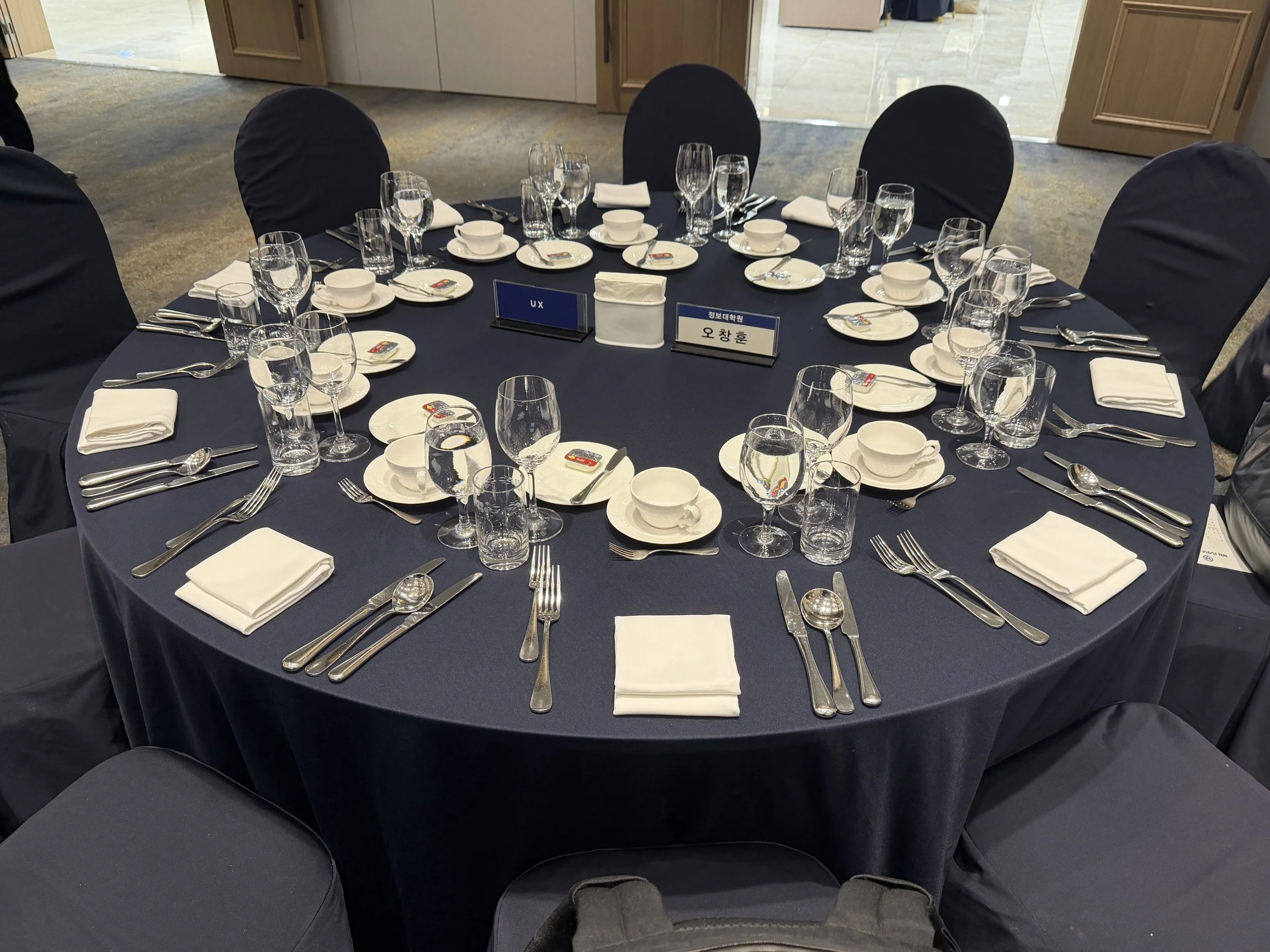 이곳이 바로 저희 axlab 테이블입니다 🍽️ 식기가 이것저것 꽤 많이 놓여 있는 걸 보니, 아무래도 음식이 코스로 나올 것 같은 예감이 드네요 ㅎㅎ 너무너무 기대가 되는 것~ 😆✨