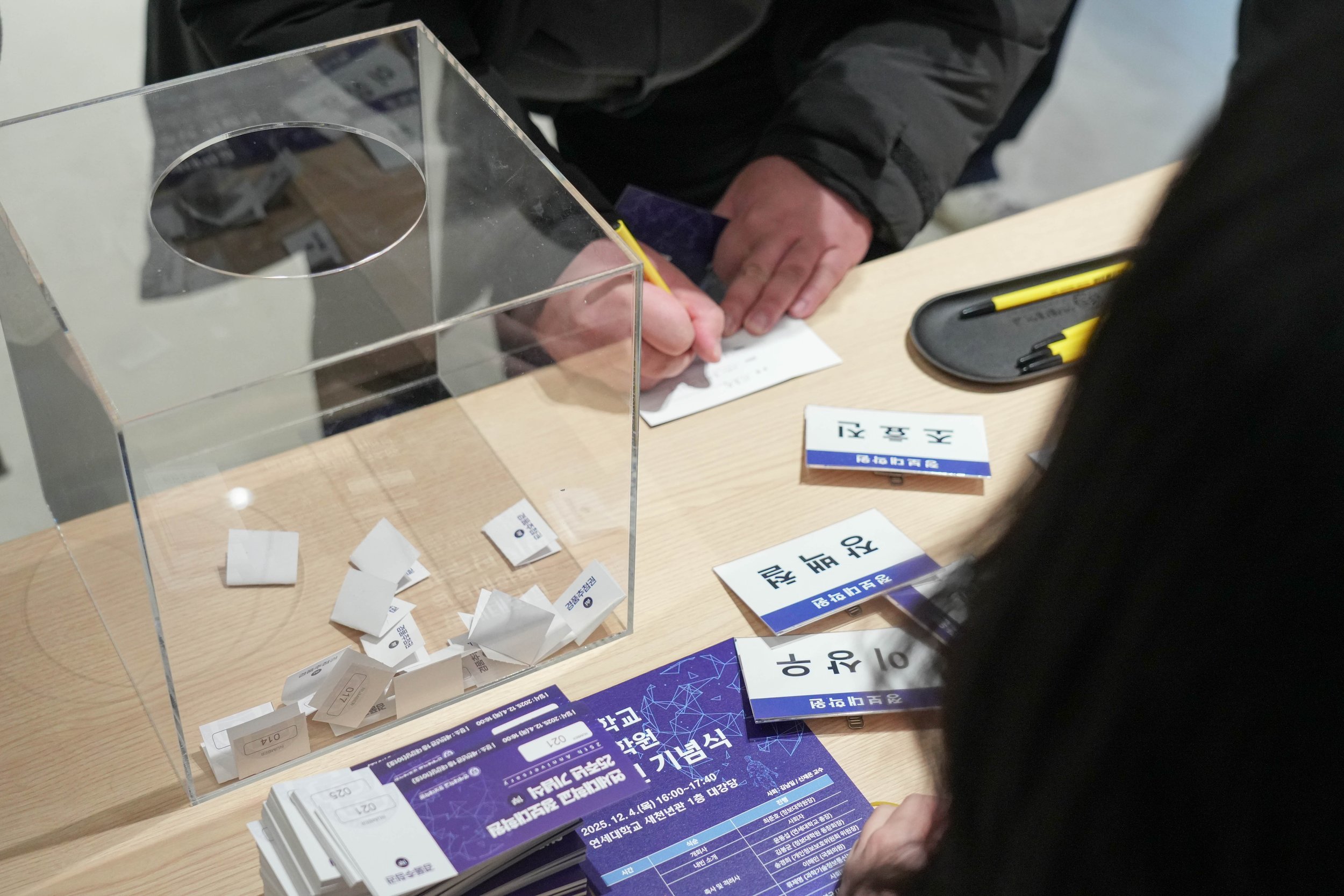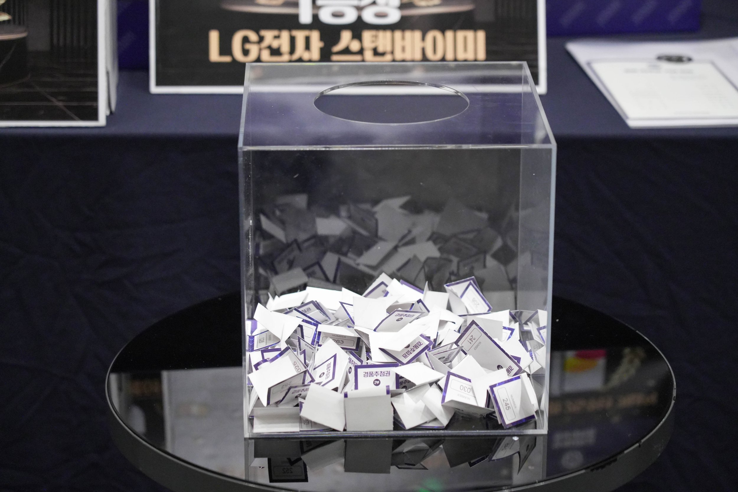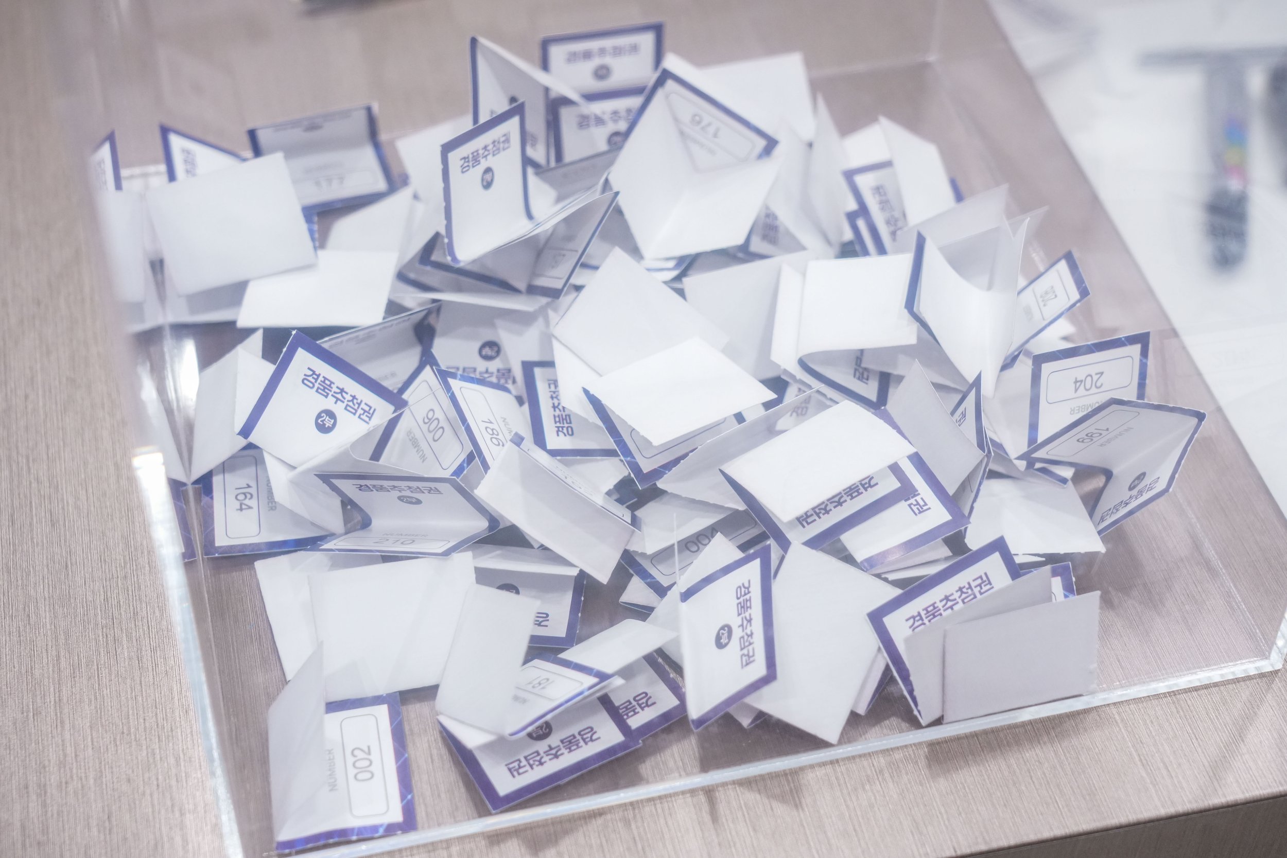 경품 추첨권들이 아크릴 박스 안에 또다시 차곡차곡 쌓이기 시작했습니다 🎁 제 번호도… 딱 한 번만 불러주시면 참으로 감사하겠습니다 :) ㅋㅋ 🙏😆
