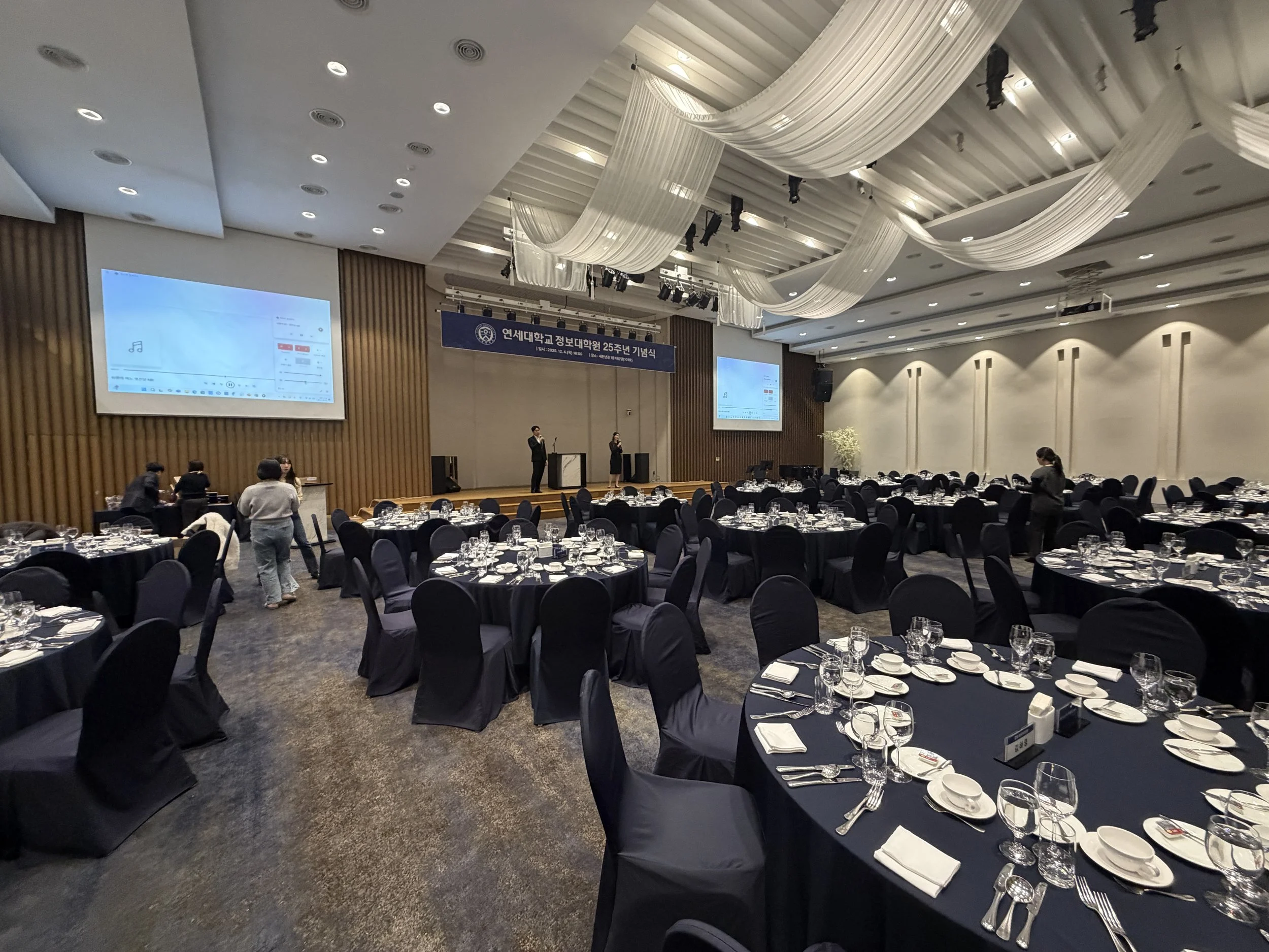 연세대학교 동문회관 대연회 홀의 모습입니다. 생각보다 엄청 넓은 공간이어서 살짝 놀라기도 했네요… 😮 아직 본격적인 시작 전이라, 무대에서는 축가팀의 리허설이 한창 진행 중이었고요. 그 사이 오교수님과 이교수님도 앞쪽에서 이것저것 식순과 관련된 최종 체크를 하며 분주히 움직이고 계셨습니다 👀📋