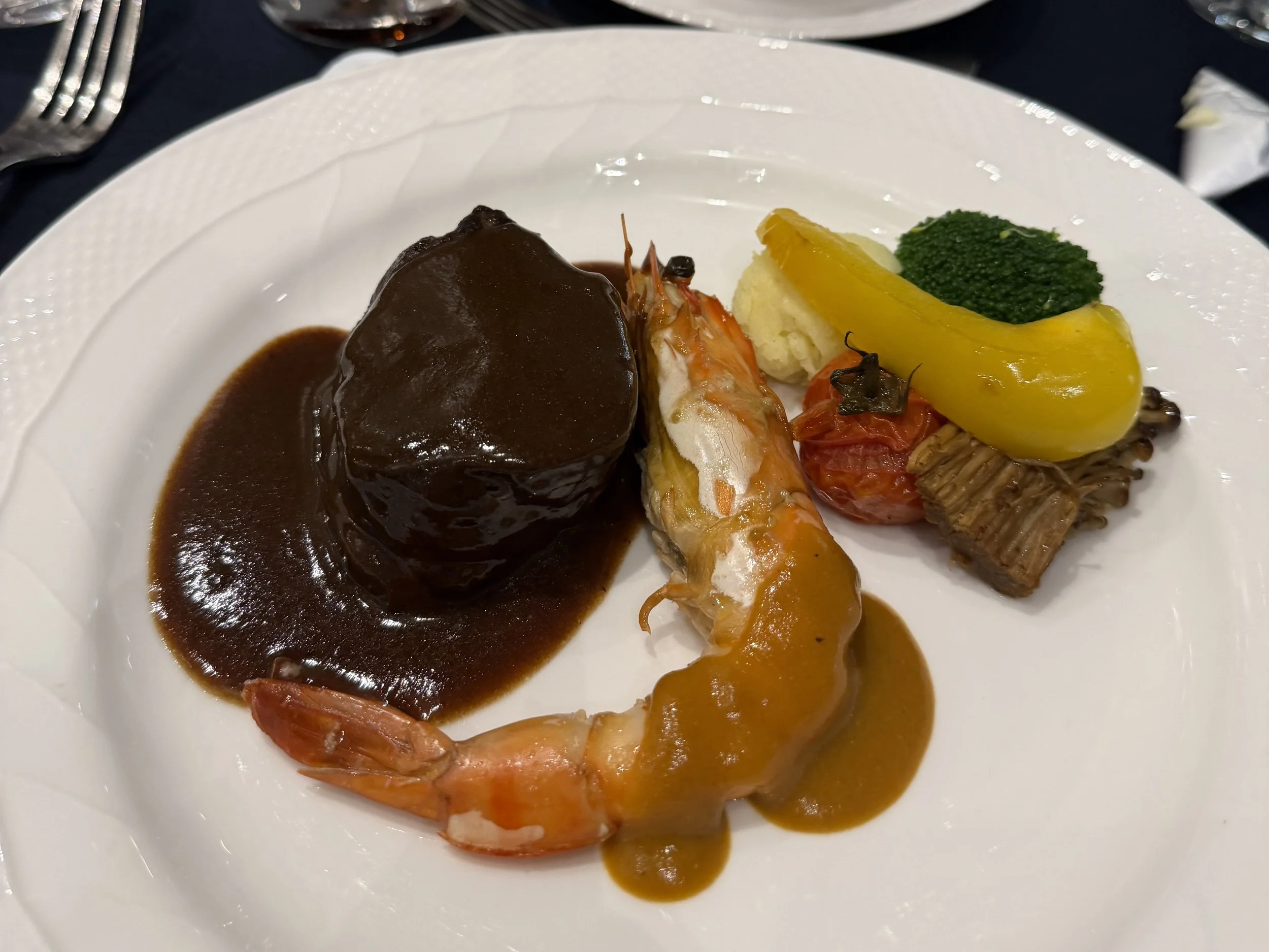 만찬이 시작될 즈음에는 다들 정말 너무너무 배가 고픈 상태였는데요 😅 음식이 나오자마자, 거의 게눈 감추듯순식간에 해치워 버렸답니다~ 그만큼 코스 요리도 너무 맛있게 나왔고요. 메인 메뉴로는 안심 스테이크와 대하 구이가 제공되었는데, 배고픔까지 더해져 만족도가 배로 올라가는 순간이었습니다 🍽️✨